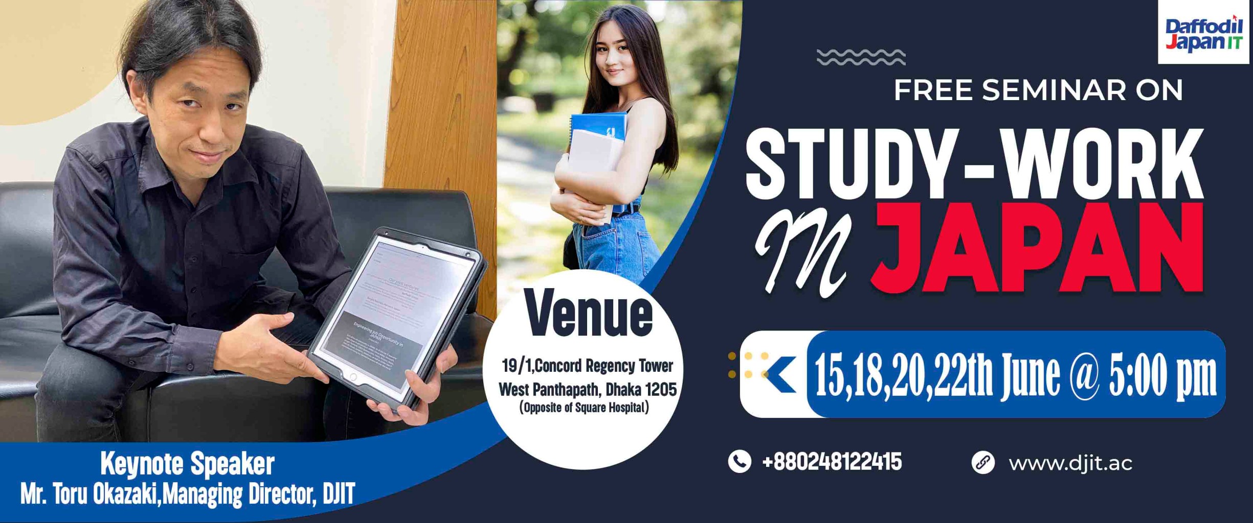 #সেমিনারের_আলোচ্য_বিষয় জব ভিসা সমূহঃ – জাপানে জব ভিসা ও জব ক্যাটাগরি নিয়ে আলোচনা – জাপানিজ কোম্পানি ও বেতন – জাপান যেতে প্রয়োজনীয় কাগজ-পত্র স্টুডেন্ট ভিসা সমূহঃ – কত খরচ পড়বে জাপান যেতে – টিউশন ফি এবং অন্যান্য ভিসা প্রসেসিং খরচ – জাপানে ভর্তি এবং ভিসা পাওয়ার প্রক্রিয়া সাথে কী কী কাগজপত্র এবং যোগ্যতা লাগবে – ব্যাংক ব্যাল্যান্স এবং একাউন্ট বিষয়ক বিস্তারিত ধারনা! – পার্ট-টাইম জব পাওয়া যাবে কিনা, ফুল টাইম জব কিভাবে পাবেন? – পড়াশুনা শেষে ফুলটাইম জব করার নিশ্চয়তা আছে কিনা, থাকা-খাওয়া, নতুন দেশে টিকে থাকার ধারনা! – কীভাবে স্থায়ী আবাসন অথবা জাপানের নাগরিকত্ব পাওয়া যাবে এবং সেমিনারে অংশগ্রহণকারীদের সমস্ত প্রশ্নের বিস্তারিত উত্তর! Keynote Speaker : Mr. Toru Okazaki san Managing Director , Daffodil Japan IT, Japan Mr. Mahadee Hasan Senior Manager,DJIT S M Rassel (Ab Rafi) Senior CCME, DJIT #সেমিনারের_সময়_সূচী : Offline:Wednseday, June 15 ,2022 |Time: 5:00 PM Online:Wednseday, June 15 ,2022 |Time: 5:00 PM Offline:Saturday, June 18 ,2022 |Time: 5:00 PM Online:Saturday, June 18 ,2022 |Time: 5:00 PM Offline:Monday, June 20 ,2022 |Time: 5:00 PM Online:Monday, June 20 ,2022 |Time: 5:00 PM Offline:Wednseday, June 22 ,2022 |Time: 5:00 PM Online:Wednseday, June 22,2022 |Time: 5:00 PM Seminar Joining Link: meet.google.com/rfi-bbny-pib Venue : Daffodil Japan IT Limited Daffodil Concord Tower (Ground Floor) 19/1, West Panthapath, Dhaka 1205 (Opposite of Square Hospital) +880248122415,+8801847140110