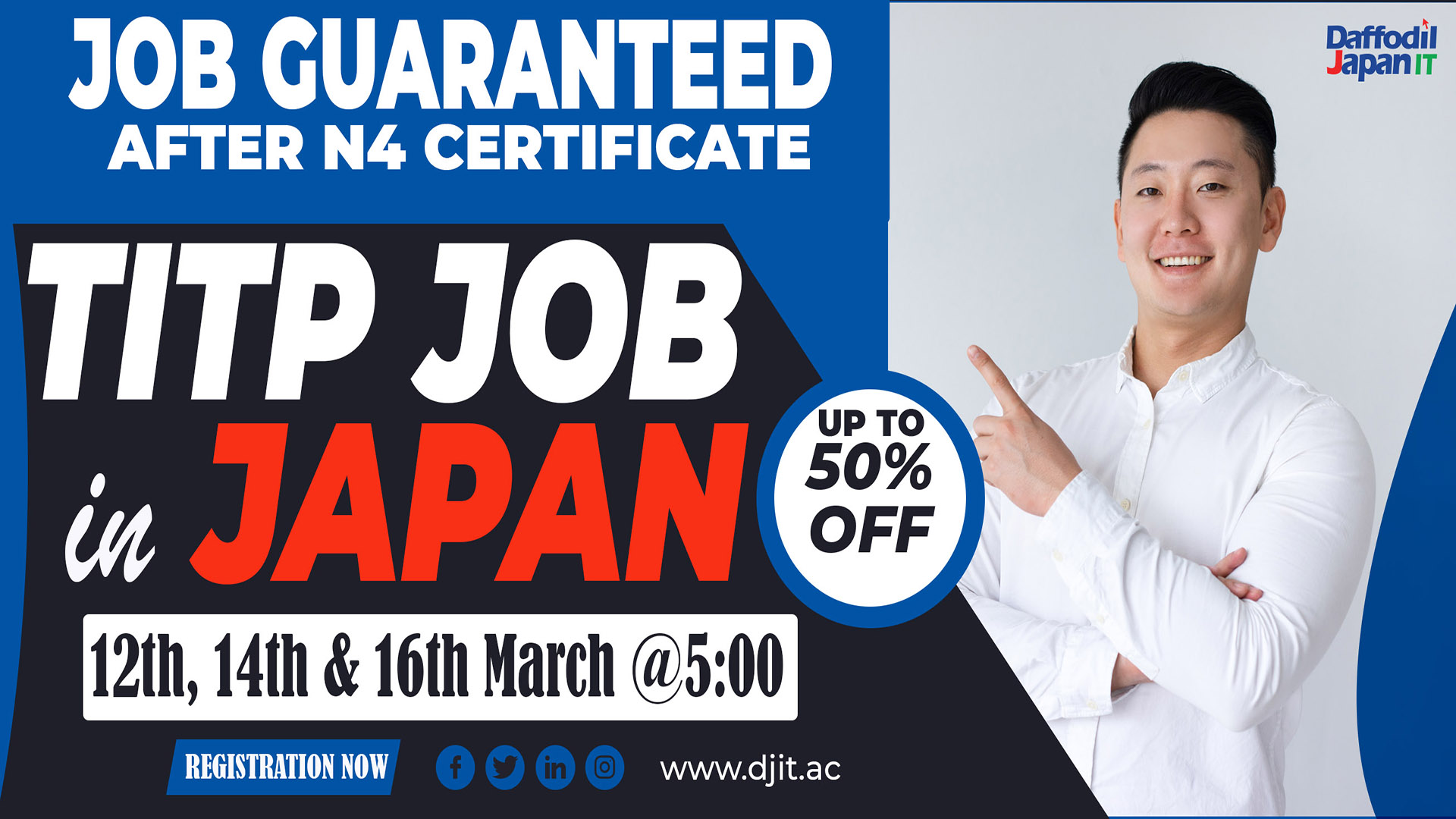 ফ্রি রেজিস্ট্রেশন করুনঃ http://djit.ac/japan_reg/ জাপানে TITP জব ও উচ্চ শিক্ষা বিষয়ক ফ্রি সেমিনার ! জাপানে নতুন সুযোগ ! মাসিক বেতন ১ লাখ থেকে ১.৫ লাখ ! Students : মাসিক আয় ১.৫ লাখ থেকে ২.৫ লাখ । Japan Entry Open সর্বোচ্চ COE সফলতা ২০২২ এপ্রিল সেশন #Big_Job_Opportunity ফ্রি রেজিস্ট্রেশন করুনঃ http://djit.ac/japan_reg/ জাপানিজ ভাষার উপর মেগা ছাড় ! এন ৪ পাশ থাকলেই নিশ্চিত জব ! সেমিনারে জয়েন করলে ৫০% পর্যন্ত ছাড় ! Note : ( Up to 50%) স্বল্প খরচে জাপানে বেশি আয়ের জব ! ইন্টার্ভিউ চলছে !! ২০২২ ! টেকনিক্যাল ইন্টার্ন ট্রেইনিং প্রোগ্রাম (TITP) চার ক্যাটাগরিতে ইন্টার্ভিউ চলছে । পাশের হার অনেক বেশি । যারা সরাসরি অংশগ্রহণ করতে ইচ্ছুক এখনই রেজিস্ট্রেশন করুন : http://djit.ac/japan_reg/ +8801847140105,+8801847140110 Are you planning to work in Japan ? To encourage N4 graduates to apply Job Category Nursing care Food Processing Construction Husbandry ____________________________________________ #ফ্রি_সেমিনার Daffodil Japan IT, জাপানিজ ও দেশের স্বনাম ধন্য ড্যাফোডিল গ্রুপের ড্যাফোডিল জাপান আইটি একটি অঙ্গ প্রতিষ্ঠান। সফলতার সাথে শত শত শিক্ষার্থী ড্যাফোডিল জাপান আইটির মাধ্যমে জাপানে ক্যারিয়ার গড়েছেন। সেই সফলতার ধারাবাহিকতায় আবারও আমরা উচ্চ শিক্ষা ও চাকরি বিষয়ক সেমিনার আয়োজন করেছি । আপনাদের সবাইকে সেমিনারে আমন্ত্রণ । সেমিনারটি সকলের জন্যে উন্মুক্ত। #সেমিনারের_আলোচ্য_বিষয় জব ভিসা সমূহঃ – জাপানে জব ভিসা ও জব ক্যাটাগরি নিয়ে আলোচনা – জাপানিজ কোম্পানি ও বেতন – জাপান যেতে প্রয়োজনীয় কাগজ-পত্র স্টুডেন্ট ভিসা সমূহঃ – কত খরচ পড়বে জাপান যেতে – টিউশন ফি এবং অন্যান্য ভিসা প্রসেসিং খরচ – জাপানে ভর্তি এবং ভিসা পাওয়ার প্রক্রিয়া সাথে কী কী কাগজপত্র এবং যোগ্যতা লাগবে – ব্যাংক ব্যাল্যান্স এবং একাউন্ট বিষয়ক বিস্তারিত ধারনা! – পার্ট-টাইম জব পাওয়া যাবে কিনা, ফুল টাইম জব কিভাবে পাবেন? – পড়াশুনা শেষে ফুলটাইম জব করার নিশ্চয়তা আছে কিনা, থাকা-খাওয়া, নতুন দেশে টিকে থাকার ধারনা! – কীভাবে স্থায়ী আবাসন অথবা জাপানের নাগরিকত্ব পাওয়া যাবে এবং সেমিনারে অংশগ্রহণকারীদের সমস্ত প্রশ্নের বিস্তারিত উত্তর! Keynote Speaker : Mr. Toru Okazaki san Managing Director , Daffodil Japan IT, Japan #সেমিনারের_সময়_সূচী : Saturday ,March 12, 2022 | Time: 5:00 PM Monday ,March 14 ,2022 | Time: 5:00PM Wednesday, March 16 ,2022 |Time: 5:00 PM Seminar Joining Link: meet.google.com/rfi-bbny-pib +880248122415,+8801847140105,+8801847140110 info@djit.ac