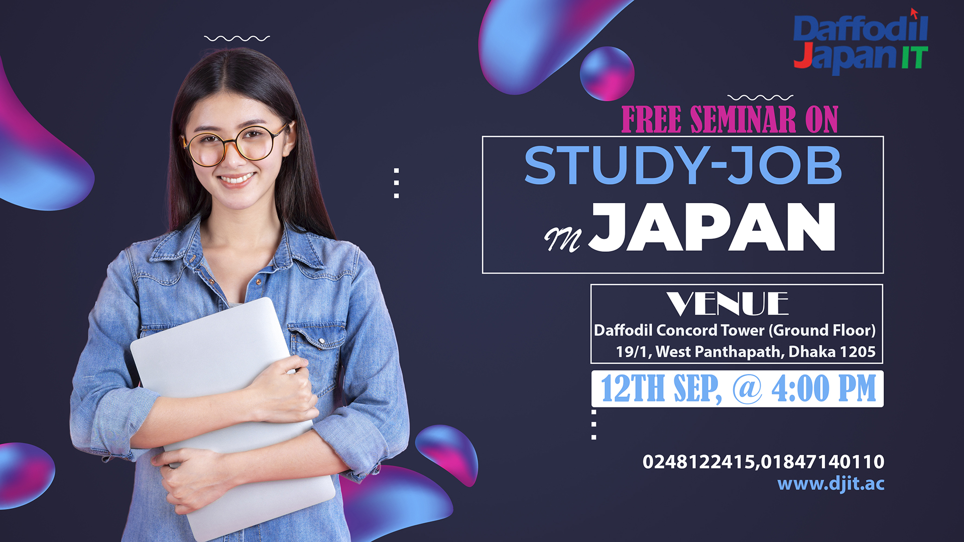 জাপানে জব ও উচ্চ শিক্ষা বিষয়ক ফ্রি সেমিনার Registration Now :http://djit.ac/japan_reg/ 0248122415,01847140110 #ফ্রি_সেমিনার Daffodil Japan IT, জাপানিজ ও দেশের স্বনাম ধন্য ড্যাফোডিল গ্রুপের ড্যাফোডিল জাপান আইটি একটি অঙ্গ প্রতিষ্ঠান। সফলতার সাথে শত শত শিক্ষার্থী ড্যাফোডিল জাপান আইটির মাধ্যমে জাপানে ক্যারিয়ার গড়েছেন। সেই সফলতার ধারাবাহিকতায় আবারও আমরা উচ্চ শিক্ষা ও চাকরি বিষয়ক সেমিনার আয়োজন করেছি । আপনাদের সবাইকে সেমিনারে আমন্ত্রণ । সেমিনারটি সকলের জন্যে উন্মুক্ত। ফ্রি রেজিস্ট্রেশন করতে এখানে ক্লিক করুনঃ http://djit.ac/japan_reg/ #সেমিনারের_সময়_সূচী : Date : 12 September, 2021 Time: 4:00 PM #সেমিনারের_আলোচ্য_বিষয় জব ভিসা সমূহঃ – জাপানে জব ভিসা ও জব ক্যাটাগরি নিয়ে আলোচনা – জাপানিজ কোম্পানি ও বেতন – জাপান যেতে প্রয়োজনীয় কাগজ-পত্র স্টুডেন্ট ভিসা সমূহঃ – কত খরচ পড়বে জাপান যেতে – টিউশন ফি এবং অন্যান্য ভিসা প্রসেসিং খরচ – জাপানে ভর্তি এবং ভিসা পাওয়ার প্রক্রিয়া সাথে কী কী কাগজপত্র এবং যোগ্যতা লাগবে – ব্যাংক ব্যাল্যান্স এবং একাউন্ট বিষয়ক বিস্তারিত ধারনা! – পার্ট-টাইম জব পাওয়া যাবে কিনা, ফুল টাইম জব কিভাবে পাবেন? – পড়াশুনা শেষে ফুলটাইম জব করার নিশ্চয়তা আছে কিনা, থাকা-খাওয়া, নতুন দেশে টিকে থাকার ধারনা! – কীভাবে স্থায়ী আবাসন অথবা জাপানের নাগরিকত্ব পাওয়া যাবে এবং সেমিনারে অংশগ্রহণকারীদের সমস্ত প্রশ্নের বিস্তারিত উত্তর! Date : 12th September , 2021 Time: 4:00 PM Venue: Daffodil Concord Tower (Ground Floor) 19/1, West Panthapath, Dhaka 1205 (Opposite of Square Hospital)